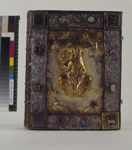 | Keywords: -Gospel book- - Upper Cover (Add. ms 11848).jpg Style Treasure binding Religious miscellaneous; Caption Upper Cover; Colour multi-coloured; Edge Unspecified exhibition history Decorative Technique Onlaid Jewelled; Cover Material Metal Silver Treasure binding;1st half of the 9th century; refurbished in 14th and 19th centuries Repoussé silver covers over wooden boards of Christ in Majesty on the upper cover and the Agnus Dei on the lower with foliate decoration and enamel bosses of the symbols of the Evangelists the eagle of St John and the ox of St Luke the two remaining symbols are missing in each corner of the upper cover probably a 14th-century Limoges addition Coloured stones were replaced in 1838 for Bishop Butler The clasps were also probably replaced 19th century Bone relics set within the oak boards of the cover; perhaps original object history Text c 820-c 830; Tours France; Unspecified object type Cc-zero place of creation Binding France place of discovery Unspecified British Library image http //www bl uk/catalogues/bookbindings/LargeImage aspx RecordId 020-000018402 ImageId ImageId 57071 Copyright BL Gospel book Uploaded with GWToolset Gospel book - Upper Cover Add ms 11848 http //www webarchive org uk/bldatasets/bindings/add_ms_11848_fblefr jpg Bookbinding 9th-century bookbinding Gospel Book - BL Add11848 British Library Bookbindings |