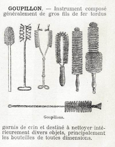 | Keywords: Goupillon epicier.jpg Goupillon Image provenant du Dictionnaire encyclopédique de l'épicerie et des industries annexes par Albert Seigneurie édité par L'Épicier en 1904 page 273 Goupillon Instrument compose généralement de gros fils de fer tordus garnis de crin et destine a nettoyer intérieurement divers objets principalement les bouteilles de toutes dimensions Bottle brushes and cleaning brushes of various designs Picture from Dictionnaire encyclopédique de l'épicerie et des industries annexes par Albert Seigneurie édité par L'Épicier en 1904 page 273 translation of information on source Brush Image from the Encyclopedic Dictionary of groceries and related industries by Albert Lord published by The Grocer in 1904 page 273 translation of text in image Brush Instrument usually consisting of a big piece of twisted iron and lined with horsehair intended to clean the inside of various objects mainly bottles of all sizes PD-old Cleaning equipment Images from Dictionnaire encyclopédique de l'épicerie et des industries annexes Brushes |