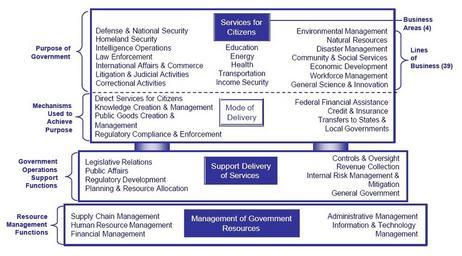 Keywords: Government Business Reference Model.jpg Government Business Reference Model svg BUSINESS REFERENCE MODEL BRM The BRM provides a means to describe the business operations of the Federal Government independent of the agencies that perform them The model is the primary layer of the FEA and the foundation for the analysis of service components technology data and performance In the model of the BRM above four Business Areas separate Government operations into highlevel categories relating to the purpose of Government Services for Citizens the mechanisms the Government uses to achieve its purpose Mode of Delivery the support functions necessary to conduct Government operations Support Delivery of Services and the resource management functions that support all areas of the Government ™s business Management of Government Resources The model ™s four Business Areas are decomposed into 39 Lines of Business Each business line includes a collection of Sub-functions that represent the lowest level of granularity in the BRM For example the Environmental Management Line of Business encompasses three Subfunctions Environmental Monitoring and Forecasting; Environmental Remediation; and Pollution Prevention and Control http //www archives gov/records-mgmt/pdf/rm-profile pdf FEA Records Management Profile Version 1 0 2005-12-15 FEA Image BRM Overview jpg ; File Government Business Reference Model ja jpg PD-USGov Business reference models Federal Enterprise Architecture |