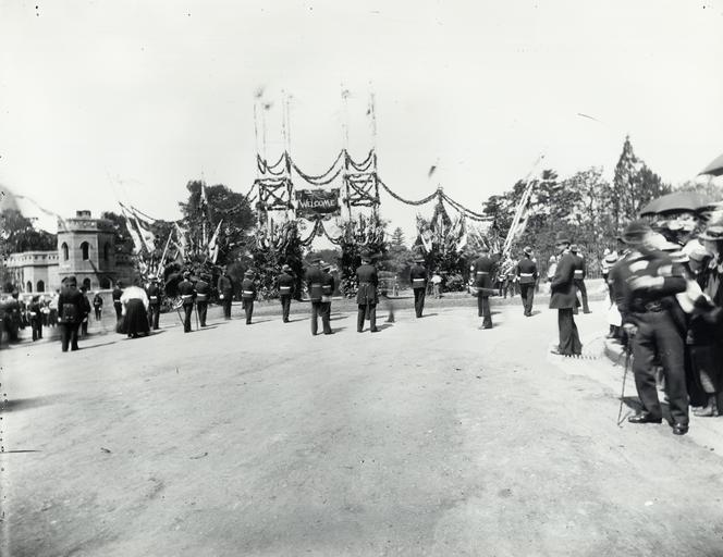 View Original:Government_House_gates,_Macquarie_Street,_Sydney_(NSW),_looking_into_the_grounds,_decorated_for_the_arrival_of_the_Governor,_Lord_Hampden.jpg (6964x5370)