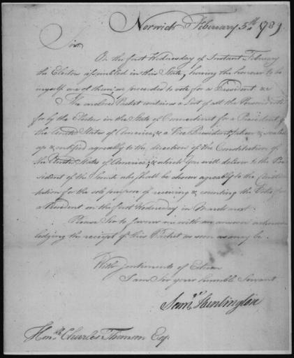 | Keywords: Governor Samuel Huntington letter transmitting a list of all the persons voted for by the electors in the state of Conne - NARA - 306208.jpg Local identifier U S Senate 03/04/1789 - Center for Legislative Archives NWL National Archives Building Room 8E 7th and Pennsylvania Avenue NW Washington DC 20408 1789-02-05 Record group Record Group 46 Records of the U S Senate 1789 - 2011 Record group ARC 375 Credentials compiled 1789 - 1998 Series ARC 306203 Variant control numbers NAIL Control Number NWL-46-ELECTION-1AH1-1 General notes Scope and content File unit File unit ARC no <gallery> File Governor Samuel Huntington letter transmitting a list of all the persons voted for by the electors in the state of Conne - NARA - 306208 tif TIFF File Governor Samuel Huntington letter transmitting a list of all the persons voted for by the electors in the state of Conne - NARA - 306208 jpg JPEG </gallery> NARA-cooperation PD-USGov Manuscript letters written messages Documents in English 1789 documents |