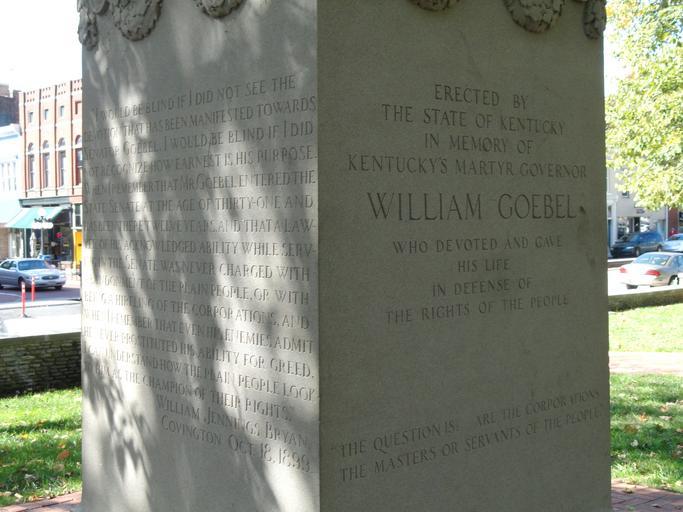 Keywords: Governor William Goebel by Charles Henry Niehaus - Frankfort, Kentucky - DSC09279.JPG en Statue of Governor William Goebel by Charles Henry Niehaus 1855-1935 Frankfort Kentucky USA Dedicated March 11 1914 This artwork is now in the public domain because the artist died more than 70 years ago Smithsonian SIRIS Control Number IAS 75005256 Inscription C H Niehaus Cast by Roman Bronze Works Inscribed on marble GOVERNOR/WILLIAM GOEBEL/THE ABLE AND MOST EFFECTIVE ADVOCATE/AND CHAMPION OF THE PEOPLE'S CAUSE/THEIR LOVED AND LOYAL FRIEND /ON JANUARY 30TH 1900 HE WAS SHOT/DOWN BY AN ASSASSIN FROM THE PRIVATE/OFFICE OF THE THEN SECRETARY OF STATE /BORN JANUARY 4TH 1856/DIED FEBRUARY 3 1900/ TELL MY FRIENDS TO BE/BRAVE AND FEARLESS AND LOYAL/TO THE GREAT COMMON PEOPLE /HIS LAST WORDS On right side of base text by William Jennings Bryan On left side of base SERVED AS STATE SENATOR/FOURTEEN YEARS/1886 TO 1900/MEMBER OF/CONSTITUTIONAL CONVENTION /1890 TO 1819/AUTHOR OF/THE ANTI LOTTERY/FRANCHISE TAX LAW/THE PIONEER IN/AMERICAN RAILWAY/REGULATION LAW/THE CHAMPION OF/SCHOOL BOOK LEGISLATION/FELLOW SERVANT LAW/EMPLOYEES LIABILITY LAW On back of base ERECTED BY/THE STATE OF KENTUCKY/IN MEMORY OF/KENTUCKY'S MARTYR GOVERNOR/WILLIAM GOEBEL/WHO DEVOTED AND HAVE/HIS LIFE/IN DEFENSE OF/THE RIGHTS OF THE PEOPLE/'THE QUESTION IS ARE THE CORPORATIONS/THE MASTERS OR THE SERVANTS OF THE PEOPLE signed Founder's mark appears Daderot 2012-10-09 11 31 14 Daderot cc0 cc0 Governor William Goebel by Charles Henry Niehaus |