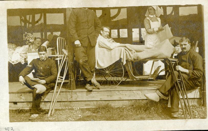 Keywords: 1910s injured soldiers injuredsoldiers nurses world war i worldwari Patients with crutches and wheelchairs sit outside a ward at the CRCS Cliveden hospital. Patients with crutches and wheelchairs sit outside a ward at the CRCS Cliveden hospital. |