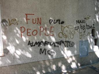 Keywords: Grafiti Fun People.JPG Un grafiti del grupo Fun People situado en la calle Joaquin V Gonzalez con Gabriela Mistral Buenos Aires Yo mismo saqué la foto libero todos los derechos y la pongo en el dominio público 2006-12-23 own assumed Thanos Graffiti in Buenos Aires |