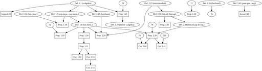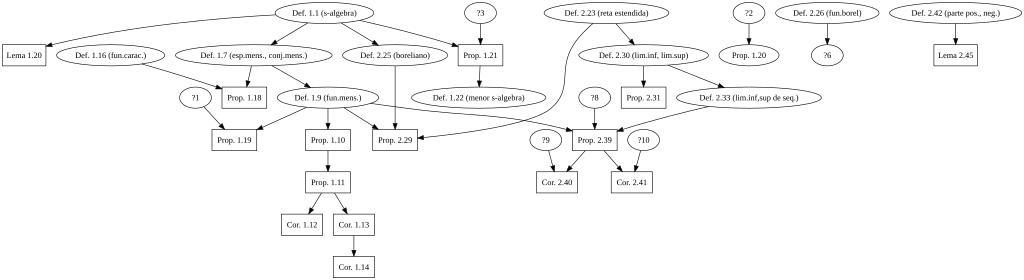 Keywords: Grafo mostrando dependência entre definições e resultados de Medida.svg Medida e integração feita com o http //www graphviz org/License php Graphviz Trata-se de um grafo ilustrando a dependência entre conceitos e resultados da Teoria da Medida Um conceito ou resultado é usado em outro se houver um caminho uma sequência de setas de mesma orientação ligando o primeiro ao segundo own Helder 10/02/2010 Código fonte digraph G / Mensurabilidade http //pt wikibooks org/w/index php oldid 137444 / Def 1 1 s-algebra -> Def 1 7 esp mens conj mens ; Def 1 7 esp mens conj mens -> Def 1 9 fun mens ; Prop 1 10 shape box; Def 1 9 fun mens -> Prop 1 10 ; Prop 1 11 shape box; Prop 1 10 -> Prop 1 11 ; Cor 1 12 shape box; Prop 1 11 -> Cor 1 12 ; Cor 1 13 shape box; Prop 1 11 -> Cor 1 13 ; Cor 1 14 shape box; Cor 1 13 -> Cor 1 14 ; Prop 1 18 shape box; Def 1 16 fun carac -> Prop 1 18 ; Def 1 7 esp mens conj mens -> Prop 1 18 ; Prop 1 19 shape box; Def 1 9 fun mens -> Prop 1 19 ; 1 -> Prop 1 19 ; Lema 1 20 shape box; Def 1 1 s-algebra -> Lema 1 20 2 -> Prop 1 20 ; Prop 1 21 shape box; Def 1 1 s-algebra -> Prop 1 21 3 -> Prop 1 21 Prop 1 21 -> Def 1 22 menor s-algebra / A reta real estendida http //pt wikibooks org/w/index php oldid 138910 / Def 2 23 reta estendida -> Def 2 30 lim inf lim sup ; Def 1 1 s-algebra -> Def 2 25 boreliano ; Def 2 26 fun borel -> 6 ; Prop 2 29 shape box; Def 1 9 fun mens -> Prop 2 29 ; Def 2 23 reta estendida -> Prop 2 29 ; Def 2 25 boreliano -> Prop 2 29 ; Prop 2 31 shape box; Def 2 30 lim inf lim sup -> Prop 2 31 ; Def 2 30 lim inf lim sup -> Def 2 33 lim inf sup de seq Prop 2 39 shape box; Def 1 9 fun mens -> Prop 2 39 ; Def 2 33 lim inf sup de seq -> Prop 2 39 ; 8 -> Prop 2 39 ; Cor 2 40 shape box; Prop 2 39 -> Cor 2 40 ; 9 -> Cor 2 40 ; Cor 2 41 shape box; Prop 2 39 -> Cor 2 41 ; 10 -> Cor 2 41 ; Lema 2 45 shape box; Def 2 42 parte pos neg -> Lema 2 45 Measure theory Graphs graph theory |