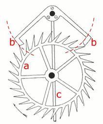 Keywords: Graham Escapement.png Graham_Escapement svg Drawing of a Graham or deadbeat clock escapement Invented by astronomer Richard Towneley in 1675 and first widely used by British clockmaker George Graham in his precision regulators around 1715 the deadbeat escapement was a more accurate version of the anchor escapement In the 19th century it replaced the anchor escapement as the standard escapement in quality pendulum clocks and is used in almost all modern pendulum clocks Alterations Removed captions and labels replaced labels in color added dotted lines moved arrow from top of wheel to side drew in pendulum crutch Labeled parts a escape wheel b pallets showing concentric locking faces c pendulum crutch Downloaded from http //books google com/books id 5SYJAAAAIAAJ pg PA108 Frederick J Britten 1896 Watch and Clock Maker's Handbook 9th Edition E F N Spon London p 108 on Google Books Published 1896 Frederick J Britten Public domain - author died in 1913 PD-old Graham Escapement |