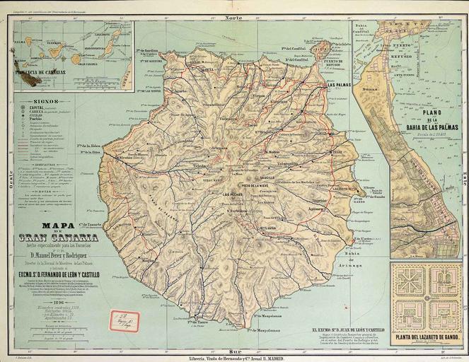 | Keywords: Gran Canaria & Las Palmas City & Las Palmas Province Old Map 1896.jpg Descripción 1 mapa col ; 46 x 62 cm Notes Escala expresada en otras unidades Longitud occidental del meridiano de S Fernando - Márgenes graduados - Relieve por sombreado Contents Incluye Provincia de Canarias - 1 3 278 688 - 10 x 17 cm - Plano de la Bahía de las Palmas - 1 20 400 - 32 x 15 cm - Planta del Lazareto de Gando - 1 2 500 - 11 x 9 5 cm Biblioteca Nacional de España Spain http //www bne es/cgi-bin/wsirtex FOR WBNBIBT4 VIS W06BICA FMT WBNARIA4 ITE 0007200013845 ISN 01455298 TOT 006 NUM 004 Madrid 1896 - Libreria Viuda de Hernando y Cº Arenal 11 Lit de Palacios Pérez y Rodríguez Manuel Reinoso José Hernando Madrid This is a faithful photographic reproduction of an original two-dimensional work of art The original image comprising the work of art itself is in the public domain because its copyright has expired PD-Art 1896 maps Maps of the history of Spain Maps of Gran Canaria Maps in Spanish |