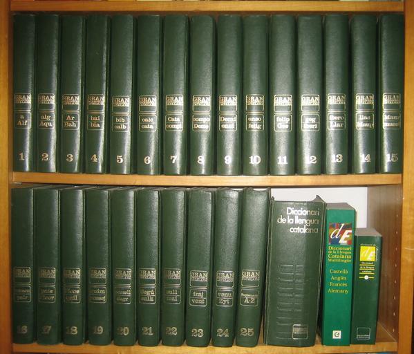 Keywords: Gran Enciclopèdia Catalana.jpg en The 25 volumes of Gran Enciclopèdia Catalana translation Great Catalan Encyclopedia This version is the first reimpression at april 1988 from the second edition at june 1986 which is from the first edition of the Encyclopedia at july 1969 This is the main catalan source of knowledge printed in paper edited a lot of times until now 2009 On the right down corner there are the Diccionari de la Llengua Catalana translation Dictionary of the Catalan Language and the Diccionari de la Llengua Catalana Multilingüe Castellà Anglès Francès Alemany translation Dictionary of the Catalan Language Multilingual Spanish English French German this with the new label's non-profit publishing company Fundació Enciclopèdia Catalana Catalan Encyclopedia Foundation The last book is a smaller version of the dictionary ca Són els 25 volums de la Gran Enciclopèdia Catalana Aquesta versió és la primera reimpressió de l'abril de 1988 la qual era reimpresa de la segona edició de juny de 1986 la qual al seu torn venia de la primera edició de l'Enciclopèdia l'abril de 1969 Aquesta és la major font catalana de coneixement impresa en paper editada moltes voltes fins a dia d'avui any 2009 Al cantó inferior a la dreta hi ha el Diccionari de la Llengua Catalana i el Diccionari de la Llengua Catalana Multilingüe Castellà Anglès Francès Alemany aquest últim amb el nou logo de l'entitat editora sense ànim de lucre la Fundació Enciclopèdia Catalana L'últim dels llibres és una versió més petita del diccionari es Son los 25 volúmenes de la Gran Enciclopèdia Catalana traducción Gran Enciclopedia Catalana Esta es la versión de la primera reimpressión de abril de 1988 la cual era reimpresa de la segunda edición de junio de 1986 la cual provenia de la primera edición de la Enciclopedia de abril de 1969 Esta es la fuente catalana de conocimiento mas grande imprimida en papel editada muchas veces hasta la fecha año 2009 En el rincón inferior derecho hay el Diccionari de la llengua catalana traducción Diccionario de la lengua catalana y el Diccionari de la llengua Catalana Multilingüe Castellà Anglès Francès Alemany traducción Diccionario de la Lengua Catalana Multilingue Castellano Inglés Francés Alemán ese último con la nueva marca de la entidad editora sin ánimo de lucro la Fundació Enciclopèdia Catalana Fundación Enciclopedia Catalana El último libro es una versión del diccionario más pequeña own Galazan 13 d'abril de 2009 La fotografia és meva i la cedeixo lliurement a qui vulgui utilitzar-la It is my own work and I give it to everybody Barcelona Països Catalans Hardcover spines Spines of encyclopedias Encyclopedias of Catalonia Catalan language encyclopedias Grup Enciclopèdia Catalana |