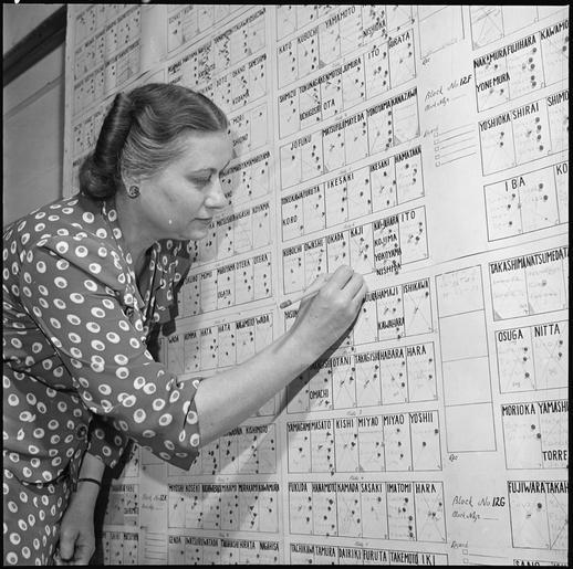 Keywords: Granada Relocation Center, Amache, Colorado. Family counsellor is shown examining wall chart. Wall . . . - NARA - 539929.tif Scope and content The full caption for this photograph reads Granada Relocation Center Amache Colorado Family counsellor is shown examining wall chart Wall charts show residence of every resident A yellow button pink pin in center of any residence shows that a relocation plan has been made and approved A red button after a name shows individual is out on terminal leave A total of nearly 15 000 evacuees were inducted into the Granada Project Amache Colorado since August 27 1942 when the first group arrived from the Merced Assembly Center to prepare the camp for those to follow The Relocation Center as its name implies was a temporary residence for those of Japanese ancestry who were transferred from their homes along the west coast under a war emergency measure of 1942 Many of the evacuees during the past three years were able to resettle and find new homes in the Middle West and eastern states From September 1 1945 to the closing date of October 15 3 105 persons have gone back to their former homes or have relocated elsewhere The last to leave the center a group of 126 left on two special coaches for Sacramento and nearby towns At the peak of its population Amache had 7 567 residents 412 births were recorded and 107 deaths during the three years of its existence General notes 539929 Local identifier 210-G-K408 Department of the Interior War Relocation Authority 02/16/1944 - 06/30/1946 NARA-Author Iwasaki Hikaru 1923- Photographer 8464103 <br /> Still Picture Records Section Special Media Archives Services Division NWCS-S National Archives at College Park 8601 Adelphi Road College Park MD 20740-6001 10/1945 Record group Record Group 210 Records of the War Relocation Authority 1941 - 1989 Record group ARC 537 Central Photographic File of the War Relocation Authority compiled 1942 - 1945 Series ARC 536000 File unit File unit ARC Variant control numbers NAIL Control Number NWDNS-210-G-K408 yes Other versions NARA-cooperation PD-USGov Hikaru Iwasaki Granada War Relocation Center |