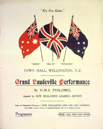 Keywords: Cover shows the Union Jack ("Hill 60"), the Australian flag ("Suvla Bay"), and the ANZAC flag ("ANZAC"). The Maori sentence "Kia Ora Katoa" appears at the top. Quantity: 1 colour photo-mechanical print(s) (on cover of programme). Physical Description: Programme cover, 285 x 225 mm. Grand Vaudeville performance by H M S "Philomel", assisted by New Zealand's leading artists. "Kia Ora Katoa". Town Hall, Wellington, N.Z. [Wednesday and Thursday, April 4th and 5th, 1917. Souvenir programme [cover]. 1917.. [Theatre programmes for variety, comedy, and music-hall shows and performances toured throughout New Zealand. 1915-1919].. Ref: Eph-B-VARIETY-1917-01-cover. Alexander Turnbull Library, Wellington, New Zealand. natlib.govt.nz/records/22732949 Cover shows the Union Jack ("Hill 60"), the Australian flag ("Suvla Bay"), and the ANZAC flag ("ANZAC"). The Maori sentence "Kia Ora Katoa" appears at the top. Quantity: 1 colour photo-mechanical print(s) (on cover of programme). Physical Description: Programme cover, 285 x 225 mm. Grand Vaudeville performance by H M S "Philomel", assisted by New Zealand's leading artists. "Kia Ora Katoa". Town Hall, Wellington, N.Z. [Wednesday and Thursday, April 4th and 5th, 1917. Souvenir programme [cover]. 1917.. [Theatre programmes for variety, comedy, and music-hall shows and performances toured throughout New Zealand. 1915-1919].. Ref: Eph-B-VARIETY-1917-01-cover. Alexander Turnbull Library, Wellington, New Zealand. natlib.govt.nz/records/22732949 |