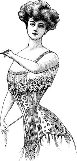 Keywords: GrandsMagasinsDuLouvreParisSaisonD'Ete1908b.gif 30514 CORSET droit en coutil broché fond noir ou écru 14 75 En uni 12 75 20514 Hauteur 0<sup>m</sup>33 Grands Magasins Du Louvre Paris Saison D'Ete 1908 page 17 PD-old Line art of women in straight fronted corsets Fashion in 1908 |