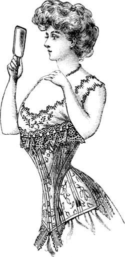Keywords: GrandsMagasinsDuLouvreParisSaisonD'Ete1908e.gif 30515<br>Hauteur 0<sup>m</sup>35 <br>30515 CORSET droit qualité extra baleine neuve <br>En coutil broché 38 <br>En satin laine noir 35 <br>En coutil blanc ou écru 33 <br>En batiste brochée 42 Grands Magasins Du Louvre Paris Saison D'Ete 1908 page 17 PD-old Fashion in 1908 Illustrations of people with mirrors Line art of women in straight fronted corsets Grands Magasins du Louvre Corsets and mirrors Batiste |