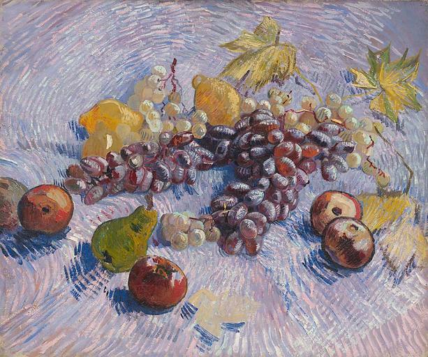 | Keywords: Grapes, Lemons, Pears, and Apples 1887 Vincent van Gogh.jpg Artwork Creator Vincent van Gogh oil canvas cm 73 92 1 Institution Art Institute of Chicago object history credit line http //www artic edu/aic/collections/artwork/14586 1887 PD-old-100 Other versions Still Life with Grapes apples lemons and pear by Vincent van Gogh |