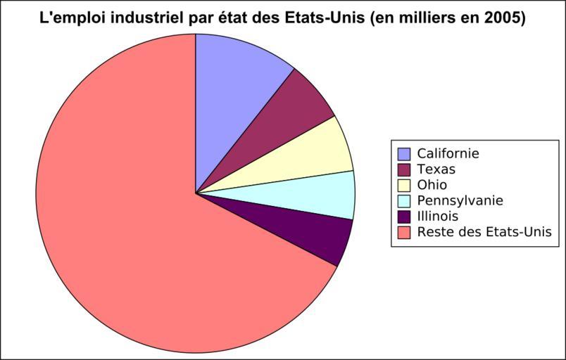 Keywords: Graph circulaire emploi par etat USA 2005.svg fr Graphique circulaire représentant l'emploi industriel aux Etats-Unis dans les cinq premiers états et dans le reste du pays en 2005 Source http //www census gov/compendia/statab/cats/manufactures html Table 968 Manufactures ”Summary by State 2006 US Census Bureau The 2009 Statistical Abstract The National Data Book Own Urban 2009-04-23 Economy of the United States |