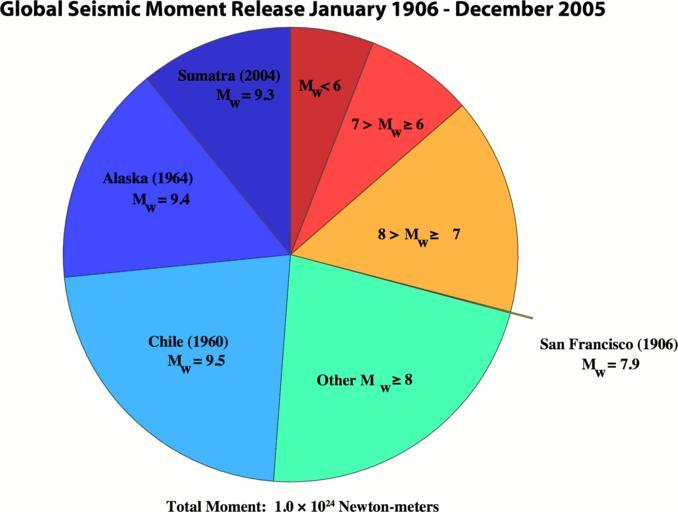 Keywords: Graph of largest earthquakes 1906-2005.png This pie chart shows how the total seismic moment released by earthquakes over the period 1906-2005 was distributed with the largest individual earthquakes left side and groups of earthquakes right side The thin sliver of the 1906 San Francisco Earthquake is also depicted for comparison purposes M<sub>w</sub> designates an earthquake's magnitude on the moment magnitude scale Earthquakes referenced in this chart Alaska 1964 Good Friday Earthquake Chile 1960 Great Chilean Earthquake San Francisco 1906 1906 San Francisco earthquake Sumatra 2004 2004 Indian Ocean earthquake Transferred from http //en wikipedia org en wikipedia<br/> 2006-12-26 Richard Aster New Mexico Tech Original uploader was 718 Bot at http //en wikipedia org en wikipedia Richard Aster graph original upload log page en wikipedia Graph_of_largest_earthquakes_1906-2005 png 2008-07-22 07 18 718 Bot 1824×1378× 350546 bytes <nowiki> graph Graph of largest earthquakes 1906-2005 jpg The current title is vague and I expected to see some pastry This pie chart shows how the total seismic moment released by earthquakes over the period 1906-2005 was distributed</nowiki> History of Image Pie final jpg 2008-05-11T16 28 35Z Seegoon Talk contribs 1067 bytes <nowiki>clean up typos fixed Univerisity †’ University using AWB</nowiki> 2008-05-10T20 20 28Z Seegoon Talk contribs 1068 bytes <nowiki>IFR</nowiki> 2008-03-29T23 23 19Z Stannered Talk contribs 955 bytes <nowiki> graph</nowiki> 2008-03-29T22 16 06Z Seegoon Talk contribs 949 bytes <nowiki></nowiki> 2008-02-17T13 46 07Z 81 57 227 118 Talk contribs 933 bytes <nowiki>simple tidying up removal of the word 'the' from This pie chart shows the how the total </nowiki> 2007-09-03T02 26 16Z Pimlottc Talk contribs 937 bytes <nowiki>links to earthquakes in chart</nowiki> 2007-02-25T01 04 12Z Bkell Talk contribs <nowiki> badJPEG </nowiki> 2007-01-30T03 31 23Z Rasteraster Talk contribs 2007-01-30T03 29 15Z Rasteraster Talk contribs <nowiki>Clarified caption</nowiki> 2006-12-28T21 47 19Z Beland Talk contribs <nowiki>left vs right side</nowiki> 2006-12-28T21 46 15Z Beland Talk contribs <nowiki>improve caption with explanation of what the chart shows</nowiki> 2006-12-26T19 37 04Z 75 161 7 226 Talk contribs <nowiki>Added links for attribution</nowiki> 2006-12-26T19 34 19Z 75 161 7 226 Talk contribs 2006-12-26T19 33 09Z 75 161 7 226 Talk contribs 2006-12-26T19 15 57Z OrphanBot Talk contribs <nowiki>Image has no copyright tag</nowiki> 2006-12-26T18 18 18Z Rasteraster Talk contribs <nowiki>Richard Aster created this figure using the resources of the IRIS consortium and the USGS Additional data was generously provided by Lynn Sykes of Lamont Doherty Earth Observatory Columbia Univerisity </nowiki> Earthquakes |