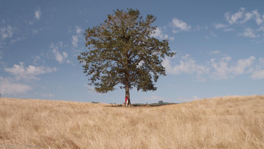 Keywords: grass fields tree boy kid cape hugging blue sky nature