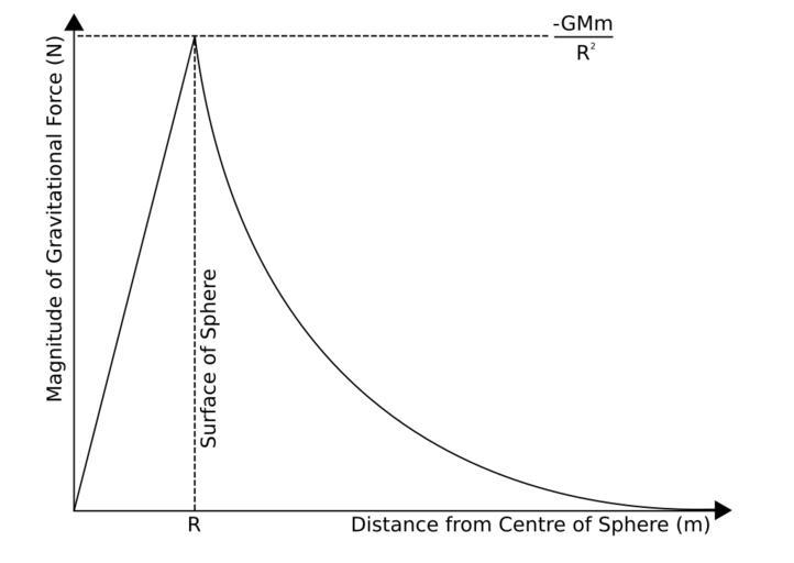 Keywords: Grav force sphere.svg en The gravitational force on an object inside and outside an uniform sphere Own Sjlegg 2009-04-06 Gravitation
