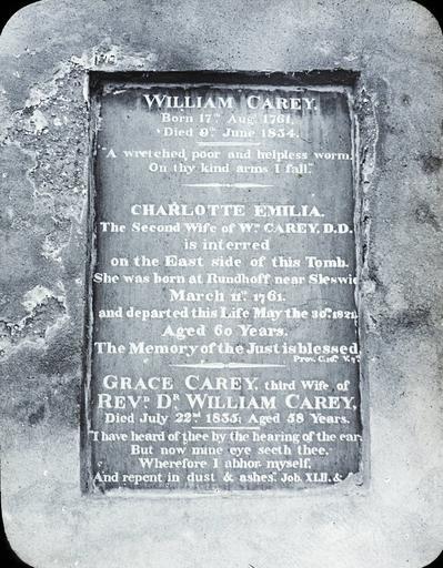 Keywords: Grave of William Carey, India, ca. 1920 (IMP-CSCNWW33-OS15-65).jpg en <br> Grave of William Carey India ca 1920 Black and white lantern slide showing the grave of missionary William Carey 1761-1834 his second wife Charlotte Emelia Carey 1761-1821 and third wife Grace Carey d 1835 Reverend Dr William Carey founded the Baptist Missionary Society in 1792 and began its first mission to India in 1794 He worked in the Danish colony of Serampore and translated the Bible into Bengali Sanskrit and into regional Indian dialects Carey was buried in the Mission Burial Ground at Serampore After falling into disrepair the grave was renovated in 2009 This slide comes from a collection created by missionaries from Regions Beyond Missionary Union an interdenominational Protestant evangelical mission working in northeast India Bihar and Orissa and Nepal Photographer Unknown Subject personal name Carey William 1761-1834 ; Carey Charlotte Emilia 1761-1821 ; Carey Grace d 1835 Filename IMP-CSCNWW33-OS15-65 tif Coverage date 1915/1925 Subject unesco Missionary work Part of collection International Mission Photography Archive ca 1860-ca 1960 Part of subcollection Photographs from the Centre for the Study of World Christianity University of Edinburgh U K ca 1900-ca 1940s Repository name Centre for the Study of World Christianity Archival file Volume4/IMP-CSCNWW33-OS15-65 tif Repository address The University of Edinburgh School of Divinity New College Mound Place Edinburgh EH1 2LX United Kingdom Geographic subject country India Format aacr2 lantern slides 8 2 x 8 2cm Geographic subject continent Asia Rights Contact the repository for details Part of series Regions Beyond Missionary Union India mixed lantern slides CSCNWW33/OS15 Repository email divinity-CSWC ed ac uk Date created 1915/1925 Publisher of the digital version University of Southern California Libraries Subject aat genre exterior views Format aat lantern slides; photographs Geographic subject state West Bengal Access conditions http //www ed ac uk/schools-departments/divinity/research/centres/world-christianity/collections-resources Geographic subject cemeteries File CSCNWW33/OS15/65 Contributor Newton Co 37 King Street Covent Garden London Subject lcsh Missionaries; Burial; Cemeteries; Tombs 1915/1925 date created author http //digitallibrary usc edu/cdm/ref/collection/p15799coll123/id/78320 PD-old-70-1923 Magic lantern images Images from USC Digital Library uploaded by Fæ International Mission Photography Archive ca 1860-ca 1960 |