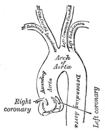 | Keywords: Gray506.png The only branches of the ascending aorta are the two coronary arteries which supply the heart; they arise near the commencement of the aorta immediately above the attached margins of the semilunar valves The branches given off from the arch of the aorta are three in number the innominate the left common carotid and the left subclavian Other fields 1 Information field Ucfirst Plate 506 before 1858 Henry Gray Anatomy of the Human Body See Book section below 506 Creator Henry Vandyke Carter Other versions/Gray506 Book Gray's Anatomy PD-old-100-1923 Gray's Anatomy plates 0506 Arteries Aorta Arcus aortae Arteria carotis communis Arteria carotis interna Arteria carotis externa Arteria subclavia |