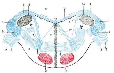 Keywords: Gray760.png Terminal nuclei of the cochlear nerve with their upper connections Schematic The vestibular nerve with its terminal nuclei and their efferent fibers have been suppressed On the other hand in order not to obscure the trapezoid body the efferent fibers of the terminal nuclei on the right side have been resected in a considerable portion of their extent The trapezoid body therefore shows only one-half of its fibers viz those which come from the left <br>1 Vestibular nerve divided at its entrance into the medulla oblongata <br>2 Cochlear nerve <br>3 Accessory nucleus of acoustic nerve <br>4 Tuberculum acusticum <br>5 Efferent fibers of accessory nucleus <br>6 Efferent fibers of tuberculum acusticum forming the striae medullares with 6 ™ their direct bundle going to the superior olivary nucleus of the same side; 6 ™ ™ their decussating bundles going to the superior olivary nucleus of the opposite side <br>7 Superior olivary nucleus <br>8 Trapezoid body <br>9 Trapezoid nucleus <br>10 Central acoustic tract lateral lemniscus <br>11 Raphé <br>12 Cerebrospinal fasciculus <br>13 Fourth ventricle <br>14 Inferior peduncle Terminal nuclei of the cochlear nerve with their upper connections Schematic The vestibular nerve with its terminal nuclei and their efferent fibers have been suppressed On the other hand in order not to obscure the trapezoid body the efferent fibers of the terminal nuclei on the right side have been resected in a considerable portion of their extent The trapezoid body therefore shows only one-half of its fibers viz those which come from the left 1 Vestibular nerve divided at its entrance into the medulla oblongata 2 Cochlear nerve 3 Accessory nucleus of acoustic nerve 4 Tuberculum acusticum 5 Efferent fibers of accessory nucleus 6 Efferent fibers of tuberculum acusticum forming the striae medullares with 6 ™ their direct bundle going to the superior olivary nucleus of the same side; 6 ™ ™ their decussating bundles going to the superior olivary nucleus of the opposite side 7 Superior olivary nucleus 8 Trapezoid body 9 Trapezoid nucleus 10 Central acoustic tract lateral lemniscus 11 Raphé 12 Cerebrospinal fasciculus 13 Fourth ventricle 14 Inferior peduncle Testut Other fields 1 Information field Ucfirst Plate 760 before 1858 Henry Gray Anatomy of the Human Body See Book section below 760 Creator Henry Vandyke Carter Book Gray's Anatomy PD-old-100-1923 Gray's Anatomy plates 0760 Neuroanatomy |