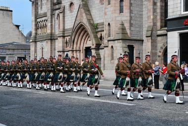 Keywords: great britain scotland aberdeen aberdeenshire union street army armed forces veterans day parade royal soldiers combatant uniform kilt regiment unit city