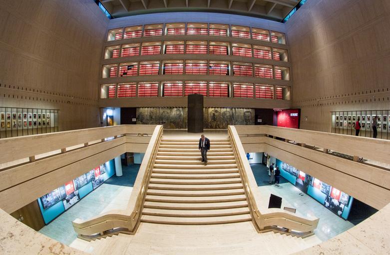 | Keywords: The Great Hall in the LBJ Presidential Library in Austin, Texas. Photo taken with a fisheye lens. LBJ Library photo by Jay Godwin The Great Hall in the LBJ Presidential Library in Austin, Texas. Photo taken with a fisheye lens. LBJ Library photo by Jay Godwin |