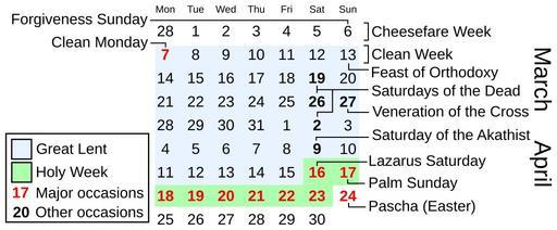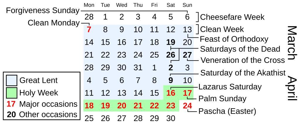 Keywords: Great Lent in March-April 2011.svg en Shows Great Lent in March/April of 2011 as observed in Eastern denominations along with many of the named days In Eastern denominations Lent covers the days marked with a blue background from Clean Monday through the Friday before Lazarus Saturday For Western denominations see File Lent in March-April 2011 svg Based on File 2011 calendar svg User Dcoetzee Nevit Dilmen <span class signature-talk >talk</span> 2012-08-02 <gallery> File 2011 calendar svg </gallery> Lent fasting period Cc-zero |