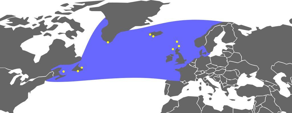 | Keywords: GreatAukMap.svg en Distribution limit marked in blue and yellow spots indicate known breeding sites of the now extinct Great Auk Based on map in Symington Grieves 1855 map in his book on the Great Auk own Shyamal 2010 Pinguinus impennis Charadriiformes distribution maps Extinct aves distribution maps |