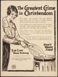 | Keywords: Greatest Crime in Christendom, ca. 1917 - ca. 1919 - NARA - 512530.jpg Local identifier 4-P-91 U S Food Administration Educational Division Advertising Section 01/15/1918 - 01/1919 Still Picture Records Section Special Media Archives Services Division NWCS-S National Archives at College Park 8601 Adelphi Road College Park MD 20740-6001 other date circa 1917 1919 Record group Record Group 4 Records of the U S Food Administration 1917 - 1920 Record group ARC 333 World War I Posters compiled 1917 - 1919 Series ARC 512439 Variant control numbers NAIL Control Number NWDNS-4-P-91 General notes Scope and content Greatest Crime in Christendom To Buy- to cook- to eat more than you need; to waste a single morsel of food that can be used- is a crime Ten million have died bravely on the field of battle Thyey at least had a chance They gave their all willingly and unselfishly Over twenty million have died of starvation- without vevn a chance to fight To these death has come only as a relief from torture worse than death- starvation It is our job- yours and ours- to save food so that the millions of starving people in Europe may have SOMETHING to eat Eat Less Waste Nothing Don t waste Food Live Simply- avoid all food waste File unit File unit ARC Other versions <gallery> File Greatest_Crime_in_Christendom _ca _1917_-_ca _1919_-_NARA_-_512530 tif TIFF File Greatest_Crime_in_Christendom _ca _1917_-_ca _1919_-_NARA_-_512530 jpg JPG </gallery> NARA-cooperation PD-USGov World War I posters of the United States USFA WWI food waste avoidance campaign |