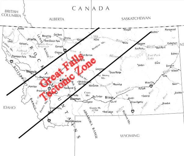 | Keywords: GreatFallstectoniczone.jpg en Map of Montana in black and white with Great Falls Tectonic Zone marked and captioned Location of tectonic zone per Thieben Scott E and Spry Paul G The Geology and Geochemistry of Cretaceous-Tertiary Alkaline Igneous Rock-Related Gold-Silver Telluride Deposits of Montana USA In Mineral Deposits From Their Origin to Their Environmental Impacts Proceedings of the Third Biennial SGA Meeting Prague Czech Republic 28-31 August 1995 Vol 3 Jan Pašava and Bohdan Kříbek eds Florence Ky Taylor Francis 1995 ISBN 905410550X nationalatlas gov US Department of Interior US Geological Survey 2007-12 Cratons Geological maps of Montana PD-USGov |