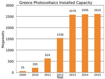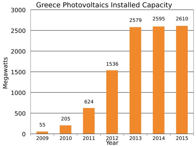 Keywords: Greece Photovoltaics Installed Capacity.svg translate yes en Installed photovoltaics in Greece from 2009 to 2015 Source http //www iea-pvps org/fileadmin/dam/public/report/PICS/IEA-PVPS_-__A_Snapshot_of_Global_PV_-_1992-2015_-_Final_2_02 pdf IEA-PVPS 2014-12-10 own Delphi234 other versions cc-zero Solar energy in Greece Photovoltaic power statistics |