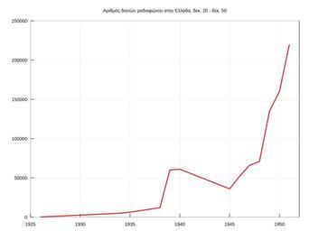 | Keywords: Greece-radio-users-mid-20s-early-50s.svg en Number of radios in Greece from mid 20s to early 50s Source cite book Χαιρετάκης ανώλης Η ραδιοφωνία στην Ελλάδα 1930-1950 2014 Έκδοση του ραδιοφωνικού σταθμού 105 5 FM Στο Κόκκινο Αθήνα 978-618-81169-3-1 2015-06-04 own CubicStar other versions cc-zero Created with Gnuplot Gnuplot script to generate this plot <source lang gnuplot > Terminal set terminal svg enhanced size 800 600 set output greece-radio-users-mid-20s-early-50s svg Data and formats set datafile missing - set datafile separator whitespace set xdata time set timefmt Y set format x Y Scale and ranges set autoscale set xrange 1925 1952 set yrange 0 250000 Ticks borders and title set border 0 set xtics 1925 1930 1935 1940 1945 1950 1955 nomirror set ytics autofreq nomirror set grid xtics linetype 1 linewidth 1 linecolor rgb efefef set grid ytics linetype 1 linewidth 1 linecolor rgb efefef Background set object 1 rectangle \ from graph 0 graph 0 to graph 1 graph 1 \ behind \ fillcolor rgb ffffff \ fillstyle solid 1 0 Inline data data << EOData 1926 200 1927 800 1934 5000 1935 6317 1938 12000 1939 60000 1940 61000 1945 36000 1946 52000 1947 66000 1948 71000 1949 135000 1950 160000 1951 220000 EOData set title Αριθμός δεκτών ραδιοφώνου στην Ελλάδα δεκ 20 - δεκ 50 plot data using 1 2 with lines lw 2 5 linecolor rgb e41a1c title </source> Uploaded with UploadWizard Gnuplot diagrams Radio of Greece |