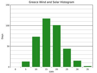 Keywords: Greece Wind and Solar Generation Histogram-Equal Max Daily.svg translate yes actual distribution The number of days that wind and solar provided less than 10 GWh was reduced from 21 to 13 and the number of days providing more than 30 GWh is decreased from 36 to 17 providing a more balanced output from day to day throughout the year This histogram demonstrates that the optimal amount of solar capacity is about twice the installed wind capacity Data from https //transparency entsoe eu/generation/r2/actualGenerationPerProductionType/show entsoe 2016-05-08 own Delphi234 other versions cc-zero Wind power in Greece Solar energy in Greece Histograms |