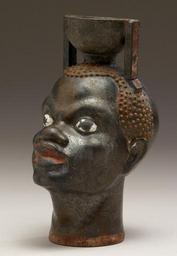 Keywords: Greek - Aryballos in the Form of Head of an African - Walters 482017 - Three Quarter Left.jpg This aryballos is in the shape of an African head It has a hemispherical mouth with a straight support rectangular in section on either side The mouth is glazed black outside and inside and is painted with red over black on top of the rim The supports are painted black on three sides and red over black on the outside The body is painted black The back of the head is smooth the lips are red the irises of the eyes are white the interior of the ears are white and red Added clay dots for the hair are painted red with slight traces of white The piece has an oval base with a reserved underside and a red band on the outside at the bottom of the vessel There is not another head vase known quite like this one The date of the vase is difficult to determine for the form of the mouth and its supports are typical of examples from the late archaic but the modelling of the face in respect to style is not far removed from the work of Sotades who was active around 460-450 BC ca 480 430 BC Classical terracotta H overall 3 5/8 x W 1 13/16 x D 2 9/16 in 9 2 x 4 65 x 6 55 cm ; Diam at mout cm 3 1 ; Diam at mouth with supports cm 3 8 ; W at base 1 3/16 x D 1 1/4 in 2 95 x 3 15 cm accession number 48 2017 4096 Joseph Brummer New York date and mode of acquisition unknown Joseph Brummer Sale New York 1949 Pt III no 2 Walters Art Museum 1949 by purchase Museum purchase 1949 place of origin Attica Greece Walters Art Museum license Ancient Greek pottery in the Walters Art Museum Ancient Greek pottery aryballoi Africans in ancient Greek art Media contributed by the Walters Art Museum needs category review Attic red-figure pottery |