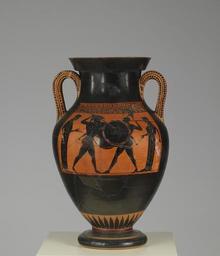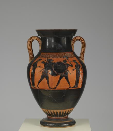 Keywords: Greek - Black-figure Amphora - Walters 4810 - Side A.jpg This vase depicts two warriors in combat flanked by two women on side A and three kneeling Greek warriors and three standing bowmen on side B ca 530 BC terracotta H 22 1/4 x W 13 3/8 x Diam 10 1/16 in 56 5 x 34 x 25 5 cm ; Diam at mout cm 25 accession number 48 10 19738 Don Marcello Massarenti Collection Rome date and mode of acquisition unknown Henry Walters city Baltimore Walters Art Museum Henry Walters Acquired by Henry Walters with the Massarenti Collection 1902 place of origin Attica Greece Walters Art Museum license Ancient Greek black-figure pottery in the Walters Art Museum Art from Greece Media contributed by the Walters Art Museum needs category review |
