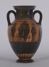 Keywords: Greek - Black-Figure Amphora - Walters 4813 - Side B.jpg This vase may portray the common departure scene of two warriors in full armor leaving home for war or it may represent a famous scene from The Iliad in which Priam king of Troy comes to claim and pay ransom for the body of his son Hector Achilles who killed Hector in single combat greets the elderly king Witnessing this scene are a second warrior who stands next to Achilles and another man standing behind ca 520 510 BC Archaic terracotta cm 32 3 20 5 accession number 48 13 10431 Don Marcello Massarenti Collection Rome no 231 Henry Walters city Baltimore Walters Art Museum Henry Walters Acquired by Henry Walters with the Massarenti Collection 1902 place of origin Athens Greece Walters Art Museum license Ancient Greek black-figure pottery in the Walters Art Museum Achilles in ancient Greek pottery Ransom of Hector Media contributed by the Walters Art Museum needs category review |