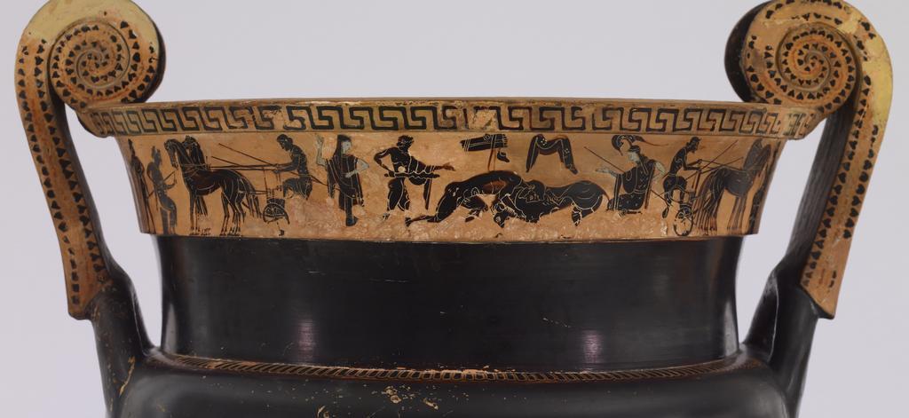 | Keywords: Greek - Black-figure Volute Krater - Walters 4829 - View A Detail.jpg Beneath the meander-adorned rim of this large volute krater is a band of figural decoration interrupted by the handles on each side At the center of the scene on one side is a trio of warriors each wearing a short chiton and a full panoply of armor The central figure lunges deeply to the right as he looks back at the soldier behind him The figure on the left prepares to plunge his raised spear into the central warrior The third soldier on the right also wields a spear in his upraised right hand poised to strike Flanking this central pair are two women in long decorated garments Each raises her hands as if to address the men or express alarm Behind the woman on the right is a horse and young man perhaps a groom Beyond them are four more figures including a naked youth with a mantle two men with staffs and another fully armed warrior To the left of the central scene behind the woman an armed warrior mounts a chariot as if ready to flee from the fighting A man seated in front of the horses interrupts the sense of motion evoked by the charioteer The two figures behind the seated man resemble those at the other end of the scene a naked youth wearing a mantle and holding a staff or spear and a standing man in longs robes with a staff Reminiscent of the central trio of warriors three figures occupy the center of the scene on the opposite side in a representation of Herakles wrestling the Nemean lion with a youth perhaps Iolaos at hand offering support as he holds the hero's club As with the composition on the other side the figures are flanked by two female figures - a seated Athena on the right and a woman fleeing on the left Further connecting the scenes is the depiction of charioteers mounting their chariots which once again face seated men with staffs A standing man with a staff frames the scene at either end Warriors figure prominently on both sides of this vase which appears to celebrate the physical prowess of the central figures The scenes highlight conduct in war and wrestling two activities in which male citizens would have been trained and encouraged to emulate their heroic prototypes ca 525 500 BC terracotta H 23 1/16 x W 20 1/2 x Diam 16 15/16 in 58 5 x 52 x 43 cm accession number 48 29 13467 Don Marcello Massarenti Collection Rome before 1897 mode of acquisition unknown cat no 209 Henry Walters city Baltimore Walters Art Museum Henry Walters Acquired by Henry Walters with the Massarenti Collection 1902 Heroes Mortals and Myths in Ancient Greece The Walters Art Museum Baltimore; Frist Center for the Visual Arts Nashville; San Diego Museum Of Art San Diego; Alexander S Onassis Public Benefit Foundation USA New York 2009-2011 place of origin Attica Greece Walters Art Museum license Ancient Greek black-figure pottery in the Walters Art Museum Art from Greece Media contributed by the Walters Art Museum needs category review |