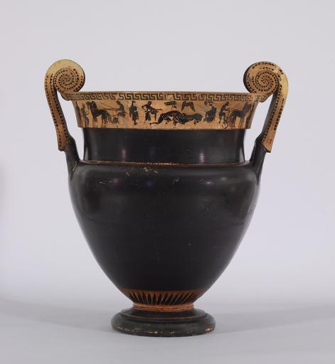 Keywords: Greek - Black-figure Volute Krater - Walters 4829 - View A.jpg Beneath the meander-adorned rim of this large volute krater is a band of figural decoration interrupted by the handles on each side At the center of the scene on one side is a trio of warriors each wearing a short chiton and a full panoply of armor The central figure lunges deeply to the right as he looks back at the soldier behind him The figure on the left prepares to plunge his raised spear into the central warrior The third soldier on the right also wields a spear in his upraised right hand poised to strike Flanking this central pair are two women in long decorated garments Each raises her hands as if to address the men or express alarm Behind the woman on the right is a horse and young man perhaps a groom Beyond them are four more figures including a naked youth with a mantle two men with staffs and another fully armed warrior To the left of the central scene behind the woman an armed warrior mounts a chariot as if ready to flee from the fighting A man seated in front of the horses interrupts the sense of motion evoked by the charioteer The two figures behind the seated man resemble those at the other end of the scene a naked youth wearing a mantle and holding a staff or spear and a standing man in longs robes with a staff Reminiscent of the central trio of warriors three figures occupy the center of the scene on the opposite side in a representation of Herakles wrestling the Nemean lion with a youth perhaps Iolaos at hand offering support as he holds the hero's club As with the composition on the other side the figures are flanked by two female figures - a seated Athena on the right and a woman fleeing on the left Further connecting the scenes is the depiction of charioteers mounting their chariots which once again face seated men with staffs A standing man with a staff frames the scene at either end Warriors figure prominently on both sides of this vase which appears to celebrate the physical prowess of the central figures The scenes highlight conduct in war and wrestling two activities in which male citizens would have been trained and encouraged to emulate their heroic prototypes ca 525 500 BC terracotta H 23 1/16 x W 20 1/2 x Diam 16 15/16 in 58 5 x 52 x 43 cm accession number 48 29 13467 Don Marcello Massarenti Collection Rome before 1897 mode of acquisition unknown cat no 209 Henry Walters city Baltimore Walters Art Museum Henry Walters Acquired by Henry Walters with the Massarenti Collection 1902 Heroes Mortals and Myths in Ancient Greece The Walters Art Museum Baltimore; Frist Center for the Visual Arts Nashville; San Diego Museum Of Art San Diego; Alexander S Onassis Public Benefit Foundation USA New York 2009-2011 place of origin Attica Greece Walters Art Museum license Ancient Greek black-figure pottery in the Walters Art Museum Art from Greece Media contributed by the Walters Art Museum needs category review |