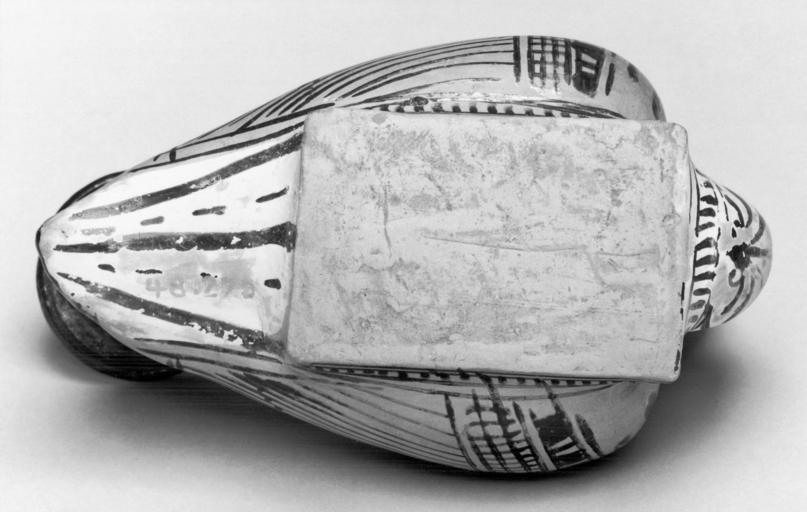 | Keywords: Greek - Duck Askos - Walters 48270 - Bottom.jpg This askos has a flaring rim that is painted black It's neck has a concave profile and is black inside It has a single strap handle The body is in the shape of a duck with a flat base and an underside in reserve with traces of miltos The wings are in reserve with details in black The underside of the tail head and breast are white-ground with black for the details A palmette with volutes beneath the bill and an interrupted cross star is above to either side A row of lines in a debased tongue pattern between sets of parallel black lines runs around the front of the base and the two sides Palmettes decorate the bows of the wings and the back of the duck late 5th century BC Classical terracotta cm 6 9 6 2 11 1 h x max w x l accession number 48 270 31793 Henry Walters Baltimore date of acquisition unknown by purchase purchased in Athens but acquired sometime later by Henry Walters Walters Art Museum Henry Walters Acquired by Henry Walters place of origin Attica Greece Walters Art Museum license Ancient Greek red-figure pottery in the Walters Art Museum Ancient Greek askoi Media contributed by the Walters Art Museum needs category review |
