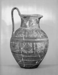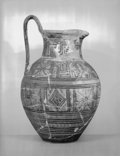 Keywords: Greek - Geometric Style "Oinochoe" - Walters 482077 - Side B.jpg Vessels of the Geometric period 900-700 BC are easily recognizable by their abstract decorative designs which had their origin in woven textiles and baskets While early period vases typically have sparse geometric motifs on a black background the amount of the decoration increased progressively to the point that objects from the late Geometric period are often entirely covered- in this example even the strap handle Friezes on the shoulder and belly of the jug contain 16 fields metopes filled with geometric designs like swastikas and rosettes as well as checkerboard zigzag lattice meander and hatched patterns An oinochoe is a wine jug with a distinctive trefoil-shaped mouth which in this case would have been closed with a lid now lost ca 750 725 BC late Geometric terracotta cm 44 28 2 accession number 48 2077 13207 Biblion Inc L Gottschalk Forest Hills New York date and mode of acquisition unknown Walters Art Museum 1955 by purchase Museum purchase 1955 place of origin Athens Greece Walters Art Museum license Ancient Greek pottery in the Walters Art Museum Ancient Greek pottery oinochoes Media contributed by the Walters Art Museum needs category review |