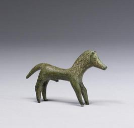 | Keywords: Greek - Horse with Incised Mane - Walters 542401.jpg The broad stance bent rear legs and extended tail of this miniature bronze horse give this small sculpture a sense of motion While the rest of the body is smooth the horse's mane is indicated by a series of short incised lines in a chevron pattern; zig-zag patterns are inscribed on each cheek The eyes are deeply recessed and may have once been inlaid with another material Horse figurines were popular votive offerings found at almost every known Geometric period sanctuary in Arcadia The high cost of maintaining horses made them status symbols that indicated the wealth and high social standing of their dedicators Langdon 1993 155 ca 750 725 BC Geometric bronze cm 4 2 7 1 4 mount cm 2 6 6 4 5 1 accession number 54 2401 20733 Mr E S David Long Island City New York date and mode of acquisition unknown Walters Art Museum 1954 by purchase Museum purchase 1954 From Pasture to Polis Art in the Age of Homer Museum of Art and Archaeology University of Missouri - Columbia Columbia 1993 The Allure of Bronze The Walters Art Gallery Baltimore 1995 Heroes Mortals and Myths in Ancient Greece The Walters Art Museum Baltimore; Frist Center for the Visual Arts Nashville; San Diego Museum Of Art San Diego; Alexander S Onassis Public Benefit Foundation USA New York 2009-2011 place of origin Arcadia Greece Walters Art Museum license Ancient Greek sculptures in the Walters Art Museum Miniature figurines Art from Greece Arcadia |