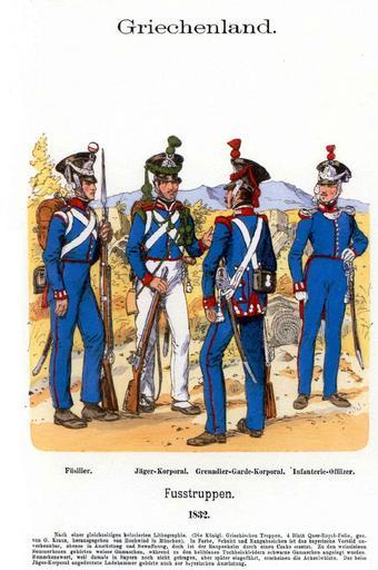 Keywords: Greek infantry, 1832.jpg en Infantrymen of the Hellenic Army in the first years of the reign of King Otto 1832-1863 L-R fusilier corporal of light infantry in summer unifrm corporal of grenadiers infantry officer el Στρατιώτες του εζικού κατά την ρώτη ερίοδο της βασιλείας του Όθωνος Α ό αριστερά στρατιώτης γραμμής ενός εκ των 4 κεντρικών λόχων τάγματος εζικού δεκανέας λόχου ακροβολιστών με θερινή στολή υ αξιωματικός λόχου ε ιλέκτων γρεναδιέρων υ ολοχαγός εζικού Richard Knötels Uniformenkunde Band XIII Richard Knötel 1857-1914 circa 1900 1914 PD-old Hellenic Army Military uniforms of Greece Uniforms Knötel Greece Uniforms Knötel Line infantry Uniforms Knötel Light infantry Uniforms Knötel Grenadiers Uniforms Knötel Infantry 19th century Infantry