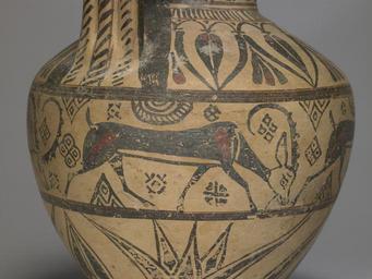 Keywords: Greek - Oinochoe in the Camirus, or "Wild Goat" Style - Walters 482108 - Detail.jpg An oinochoe was used for serving wine This piece's style is usually termed Camirus after a site on the island of Rhodes where many examples have been found but they were actually made in the Greek cities of southern Asia Minor The horizontal rows of decoration filled with wild goats and floral motifs reflect influence from the civilizations of the ancient Near East The curving contours and combination of outlined shapes and solid black masses characterize this style distinguishing it from the angular silhouettes of the pottery from the preceding Geometric period ca 625 600 BC Archaic terracotta cm 34 3 22 8 accession number 48 2108 21177 William Randolph Hearst Easte Sale San Simeon 1958 no 5494 Walters Art Museum 1958 by purchase Museum purchase 1958 In Search of Ancient Treasure 40 Years of Collecting The Walters Art Gallery Baltimore 1978 Salviati and the Antique Ancient Inspiration for Modern Glassmaking The Walters Art Museum Baltimore 2007-2008 place of origin Asia Minor Walters Art Museum license Ancient Greek pottery in the Walters Art Museum Ancient Greek pottery oinochoes Media contributed by the Walters Art Museum needs category review |