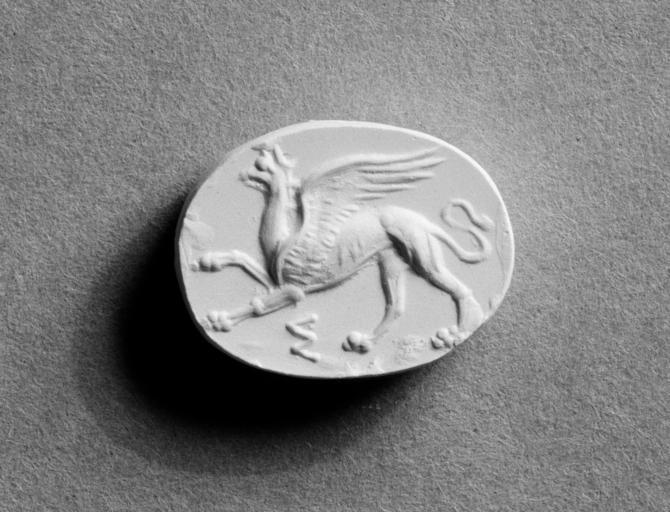 Keywords: Greek - Scaraboid with Griffin - Walters 42865 - Top.jpg This scaraboid depicts a griffin to the right and is carved intaglio century 5 BC rock crystal cm 1 8 accession number 42 865 17022 Evans date and mode of acquisition unknown 1905 catalogue plate 2 25 Henry Walters New York date and mode of acquisition unknown Sadie Jones Mrs Henry Walters New York 1931 by inheritance Mrs Henry Walters Sale Joseph Brummer New York 1942 Walters Art Museum 1942 by purchase Museum purchase formerly part of the Walters Collection 1942 Things With Wings Mythological Figures in Ancient Greek Art Ward Museum Salisbury 2009 place of origin Greece Walters Art Museum license Ancient Greek art in the Walters Art Museum Art from Greece Media contributed by the Walters Art Museum needs category review Reliefs of griffins |