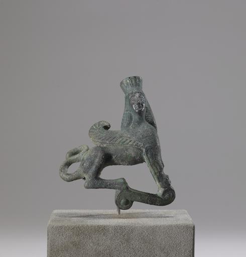 | Keywords: Greek - Sphinx Vase Ornament - Walters 541078.jpg Locri Epizephyrii present-day Gerace Italy a particularly active bronze-working center specialized in richly ornamental attachments for vessels and utensils This vase attachment is in the form of a sphinx a mythical creature with the body of a lion wings of a bird and head of a woman She wears a high polos or ritual crown century 6 BC Archaic bronze cm 8 2 7 2 5 accession number 54 1078 14212 Lambros Collection date and mode of acquisition unknown Jean P Lambros and Giovanni Dattari Sale Paris June 17-19 1912 lot 215 Henry Walters city Baltimore Walters Art Museum Henry Walters Acquired by Henry Walters place of origin Locri Epizephyrii present-day Gerace Italy Walters Art Museum license Ancient Greek sculptures in the Walters Art Museum Art from Greece Media contributed by the Walters Art Museum needs category review Ancient Greek statues of sphinx |