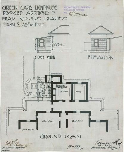 | Keywords: Green Cape Lighthouse, proposed additions to head keepers quarters, 1912.jpg en Green Cape Lighthouse Proposed Additions to Head Keepers Quarters Government Architect's Branch Drawing - Signed by the NSW Government Architect and Assistant Architect http //recordsearch naa gov au/scripts/Imagine asp B 5511578 author 1912 PD-Australia Green Cape Lighthouse Images from the National Archives of Australia Drawings of lighthouses | ||||