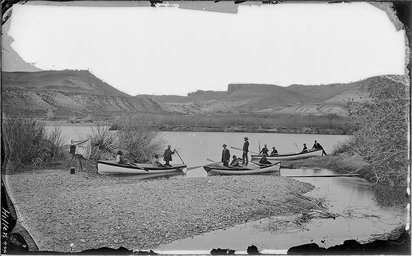 | Keywords: Green River Station, Wyoming. U.P. Railway 1871. Powell party ready to start - NARA - 517806.jpg Scope and content Green River Station Wyoming U P Railway 1871 Powell party ready to start This spot is on left bank about 1/2 mile below U/P Bridge Wyoming Old No 426 277 Identification of man and boats Any Clem Beaman with Camanite ; Jones Jack the Major Fred with Emma Dean ; Prof Thompson Steward Cap Frank with Nellie Powell Note 1 The original 11 men were Major John W Powell S V Jones Jack Hillers Frederick S Dellenbaugh Prof A M Thompson Prof J F Steward Capt F M Bishop Frank Richardson E O Beaman Andy Hattan and W Clement Powell Note 2 Nos 444 506 and 506A are not the same No 506 shows Major Powell's short right arm and he is therefore positively identified in that photograph and it is the best historical picture of the start of the trip General notes 517806 Local identifier 57-PS-444 War Department Office of the Chief of Engineers Powell Survey 1869 - ca 1874 NARA-Author Beaman E O Elias Olcott 1837-1876 Photographer 8464436 <br/> Fennemore James 1849-1941 Photographer 8464442 <br/> Hillers John K 1843-1925 Photographer 3028457 National Archives at College Park - Still Pictures RD-DC-S National Archives at College Park 8601 Adelphi Road College Park MD 20740-6001 1871 - 1878 Record group Record Group 57 Records of the U S Geological Survey 1839 - 2008 Record group ARC 386 Photographs taken by John K Hillers during the Powell Survey and other Geological Surveys compiled ca 1879 - ca 1900 Series ARC 517734 File unit File unit ARC Variant control numbers NAIL Control Number NWDNS-57-PS-444 Other versions <gallery> File Green River Station Wyoming U P Railway 1871 Powell party ready to start - NARA - 517806 tif This page as TIFF File Green River Station Wyoming U P Railway 1871 Powell party ready to start - NARA - 517806 jpg This page as JPG </gallery> Other pages NARA-cooperation PD-USGov Green River Utah |