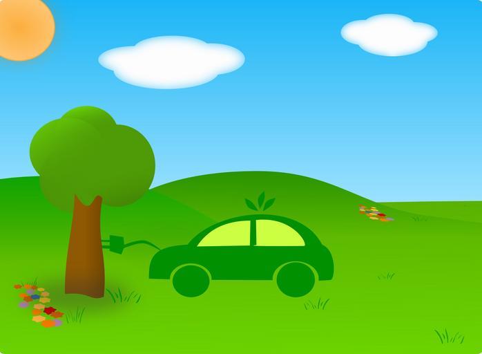 Keywords: green tree flowers environmentally friendly electric car landscape grass nature sky blue meadow sun clouds energy hill plug
