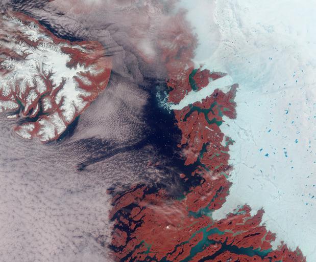 Keywords: Greenland Ilulissat.jpg From http //earthobservatory nasa gov/Newsroom/NewImages/images php3 img_id 16405 The Jakobshavn/Ilulissat Glacier on the western coast of Greenland a World Heritage site This image is a false-color near-infrared green blue view acquired by the Multi-angle Imaging SpectroRadiometer ™s nadir camera The brightness of vegetation in the near-infrared contributes to the reddish hues; glacial silt gives rise to the green color of the water; and blue-colored melt ponds are visible in the bright white ice A scattering of small icebergs in Disco Bay adds a touch of glittery sparkle to the scene The large island in the upper left is called Qeqertarsuaq To the east of this island and just above image center is the outlet of the fast-flowing Jakobshavn or Ilulissat glacier Jakobshavn is considered to have the highest iceberg production of all Greenland glaciers and is a major drainage outlet for a large portion of the western side of the ice sheet Icebergs released from the glacier drift slowly with the ocean currents and pose hazards for shipping along the coast PD-USGov Satellite pictures of Greenland World Heritage Sites in Greenland Glaciers of Greenland False-color satellite images Satellite pictures of glaciers Color-infrared satellite pictures Supraglacial lakes of Greenland |