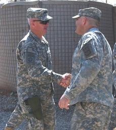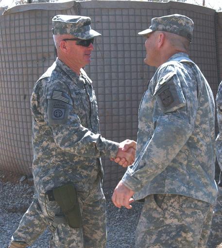 Keywords: Greetings DVIDS17803.jpg en Gen Dan MeNeill commanding general FORSCOM greets Lt Col Jeffrey Kelly commander 1st Battalion 17th Infantry Regiment 172nd Stryker Brigade Combat Team at Forward Operating Base Marez Mosul Iraq Mar 29 McNeill received a briefing at Logistical Staging Area Diamondback from Brig Gen Ricky Rife assistant division commander 101st Airborne Division and Col Michael Shields commander 172nd SBCT about the area of operations in northern Iraq After the briefing Gen McNeill boarded a Stryker vehicle and took a brief tour of the 1-17th Inf Headquarters; inspecting a damaged Stryker vehicle that was hit by an Improvised Explosive Device that caused little damage 2006-04-04 Sgt Dennis Gravelle https //www dvidshub net/image/17803 17803 2006-04-04 11 57 MOSUL IQ PD-USGov Forward Operating Base Marez 101st Airborne Division Images from DoD uploaded by Fæ |